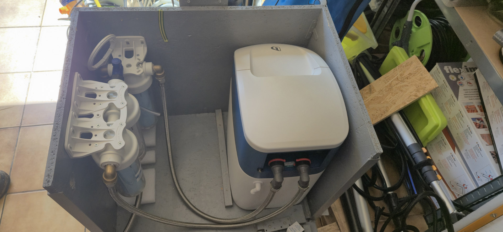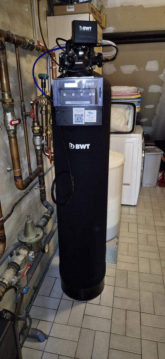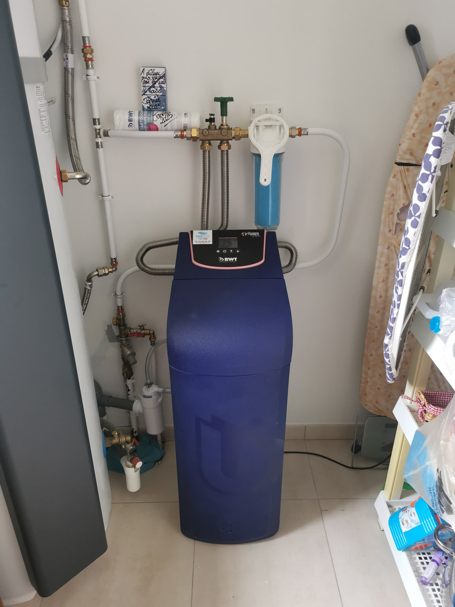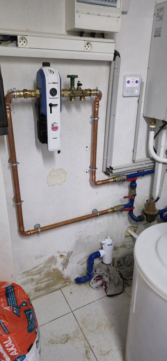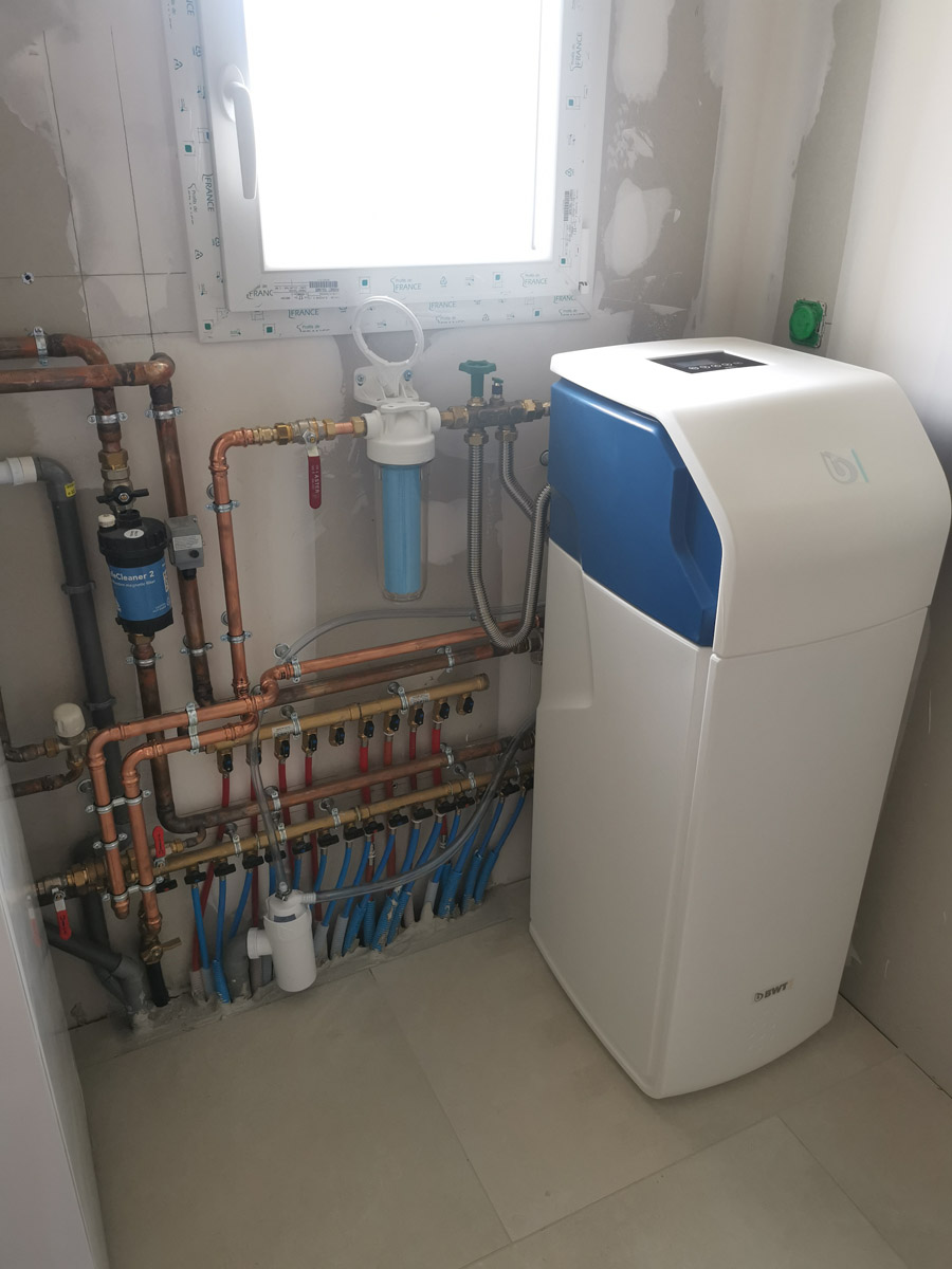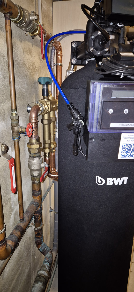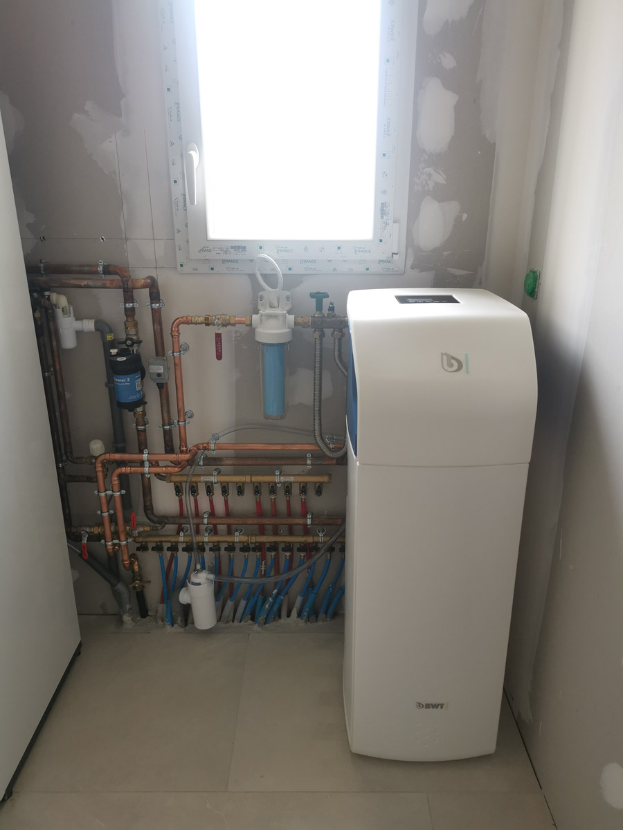 Installation Adoucisseur résidentiel BWT SPHERE XL sur maison neuve, reprise dérivation plomberie en Cuivre après constructeur